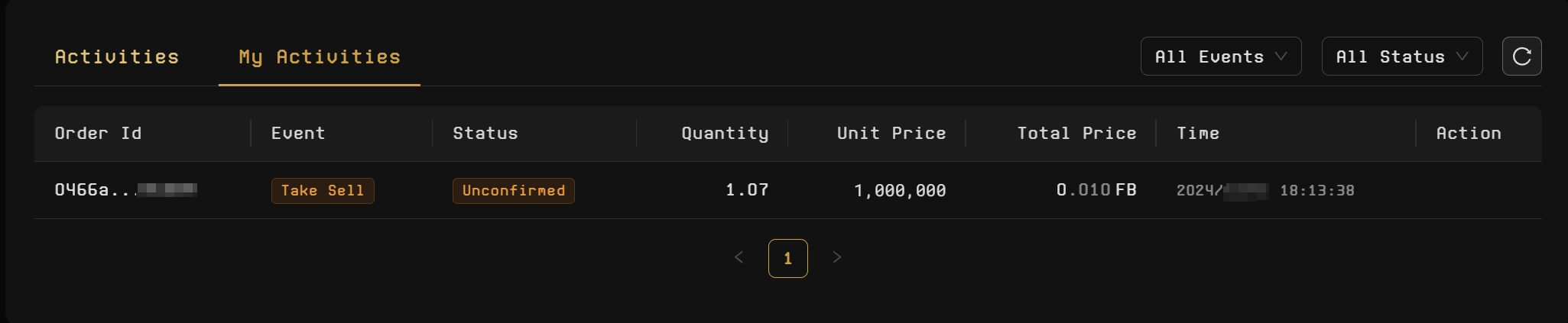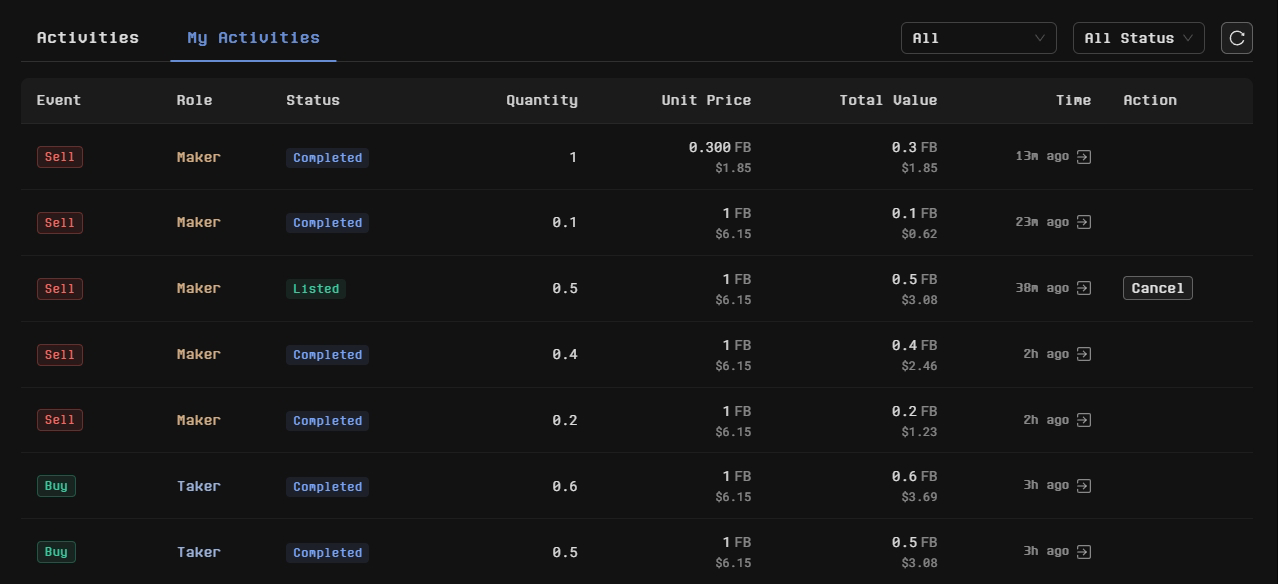 Once the transaction is signed and confirmed, the purchase will be processed. You can view your purchase history under the **My Activities** section at the bottom of the page.