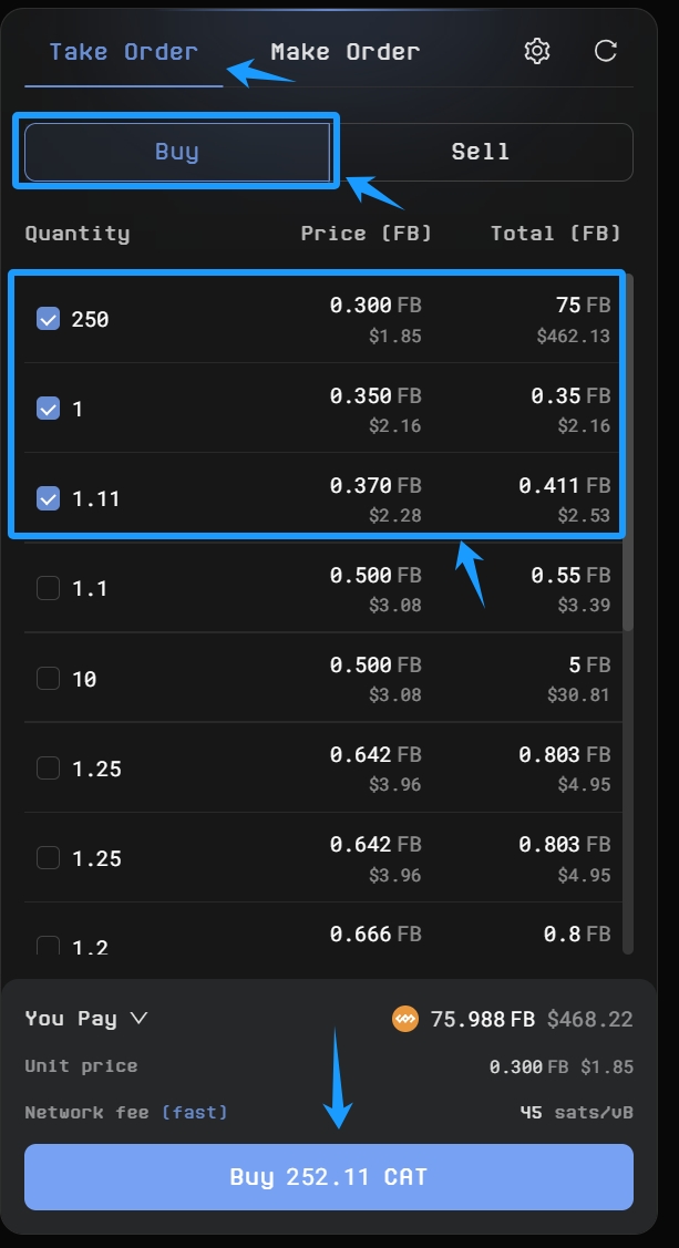 * Click **Take Order - Buy** on the marketplace, and choose multiple orders from the order book.