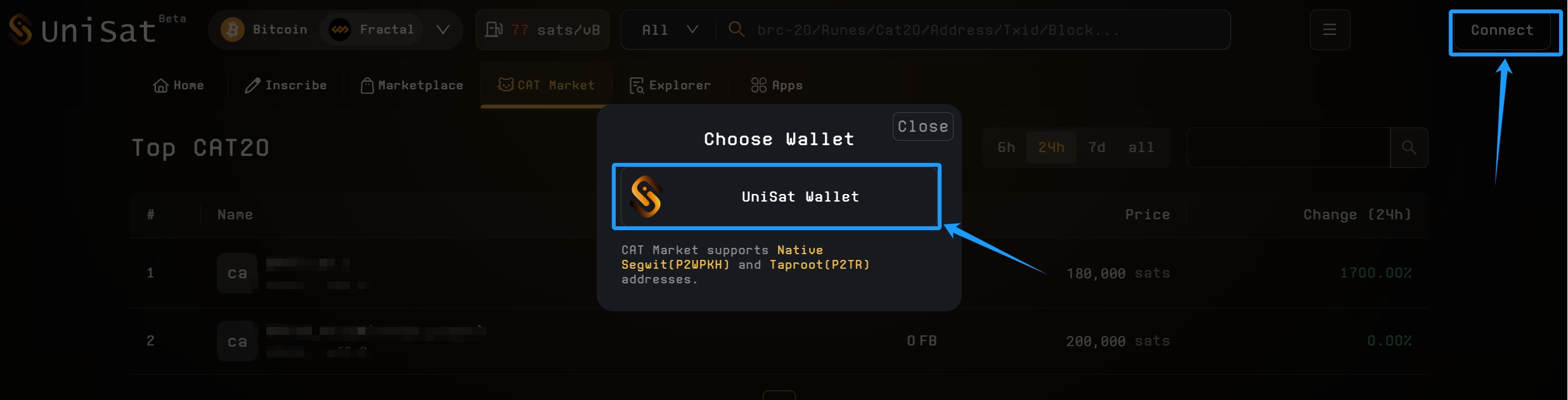 CAT Market is compatible with **Native Segwit (P2WPKH)** and **Taproot (P2TR)** addresses on UniSat. Make sure your wallet is configured to use one of these address formats.