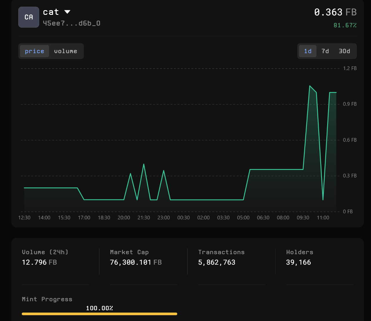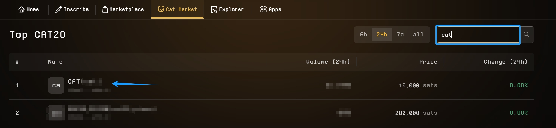 The CAT Market interface is designed with a DEX-style layout to suit the trading preferences of most users. Click on the specific ticker you want to trade, and you’ll be able to see its **price**, **price chart**, **volume**, and **market cap** for better insights into your asset.