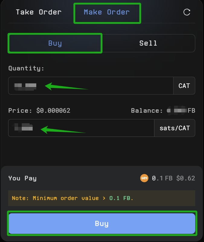 b) Enter your ideal buy price and quantity, and confirm the details before clicking **Make Order**.