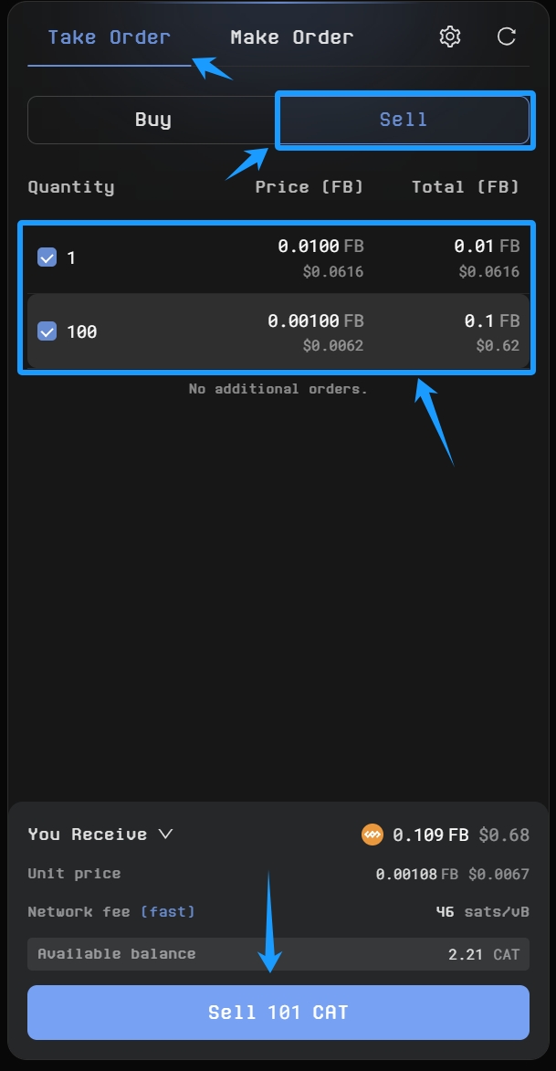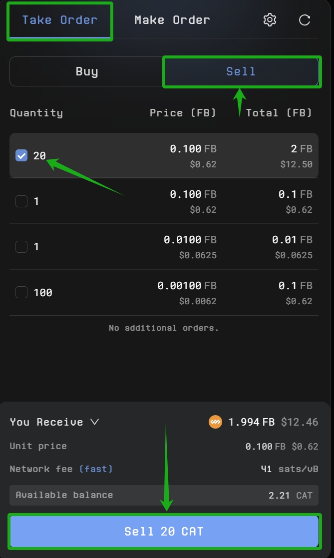 * Select the orders you wish to fulfill, click **Sell**, and sign the transaction to complete it.