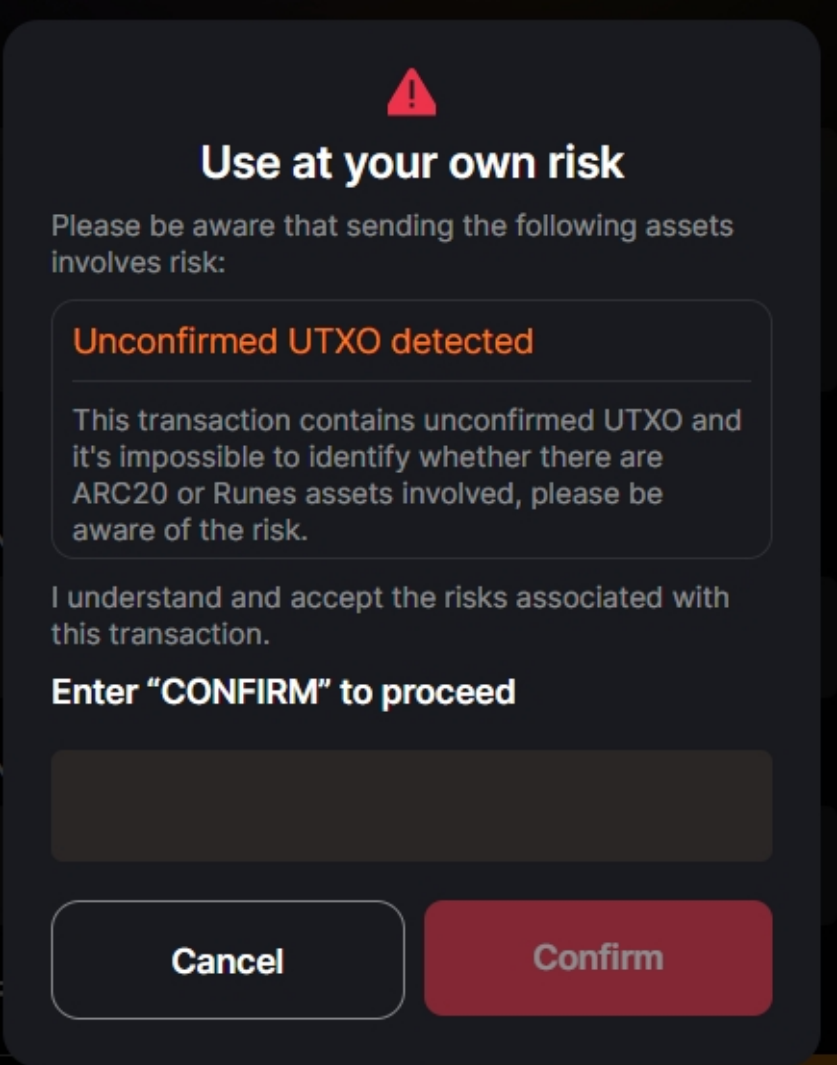 CAT20 transactions require confirmed UTXOs. If there are multiple unconfirmed UTXOs in your orders, you will not be able to spend the same UTXO again. In such cases, the page will display the following prompt. Please click "Confirm" to proceed to the next step.