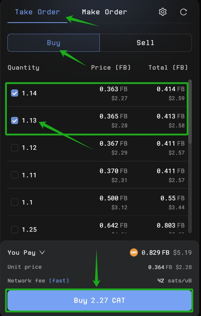 a) Click on the desired buy order from the order book (buy side) that matches your preferred price and amount, confirm the details (price and amount), and click the **Buy** button at the bottom of the page.